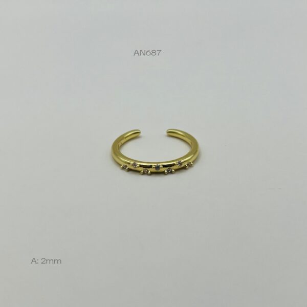 Anillo ajustable dorado con diseño de incrustación de siete zirconias. Medidas: 2mm de ancho. Oro Laminado 18k.