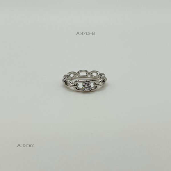 Anillo en rodio con diseño de eslabones, con un eslabón más largo al centro con incrustación de zirconia. Medidas: 6mm de ancho, #8. Oro laminado 18k.