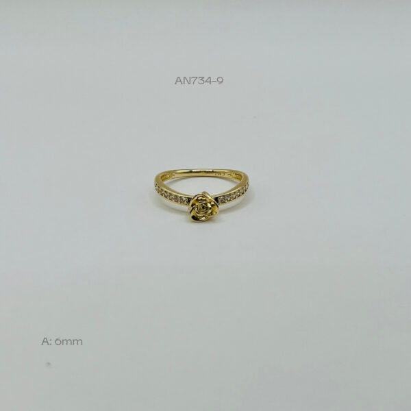 Anillo dorado con diseño de rosa y laterales con incrustación de zirconia mini. Medidas: 6mm de ancho en #9. Oro Laminado 18k.