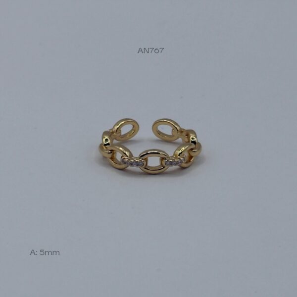 Anillo dorado con diseño de eslabones con zirconias. Medidas: 5mm de ancho, ajustable. Oro Laminado 18k.