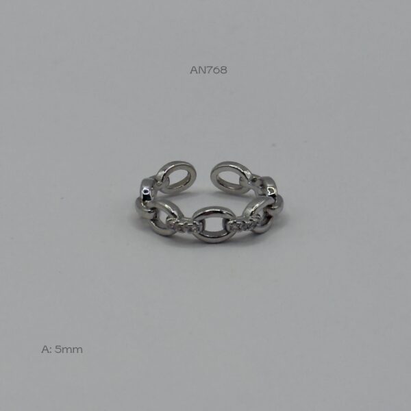 Anillo rodizado con diseño de eslabones con zirconias. Medidas: 5mm de ancho, ajustable. Oro Laminado 18k.