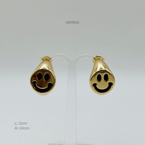 Arete dorado con diseño de carita feliz. Medidas: 2cm de largo y 1.9cm de ancho. Oro Laminado 18k.