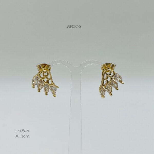 Arete dorado con diseño de alas con incrustación de zirconia en semilla en la parte inferior. Medidas: 1.5cm de largo y 1.1cm de ancho. Oro Laminado 18k.