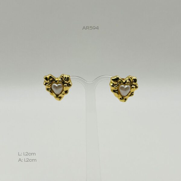 Arete dorado con diseño de corazón, con una perla al centro y contorno dorado irregular. Medidas: 1.2cm de largo y 1.2cm de ancho. Oro Laminado 18k.