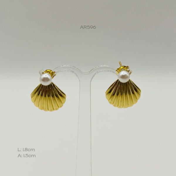 Arete dorado con diseño de conchita y una perla en la parte superior. Medidas: 1.8cm de largo y 1.5cm de ancho. Oro Laminado 18k.