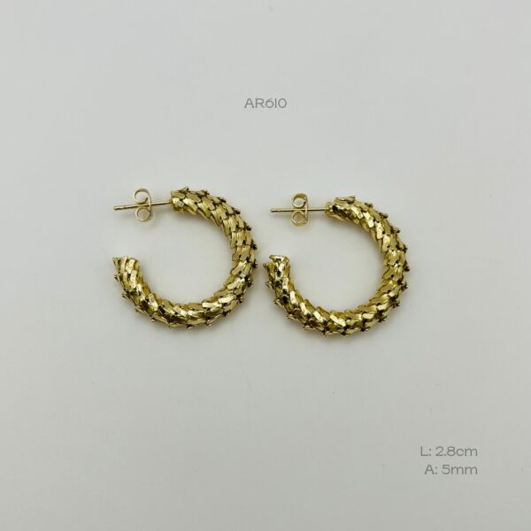 Arete dorado con diseño de escamas. Medidas: 2.8cm de largo y 5mm de ancho. Oro Laminado 18k.
