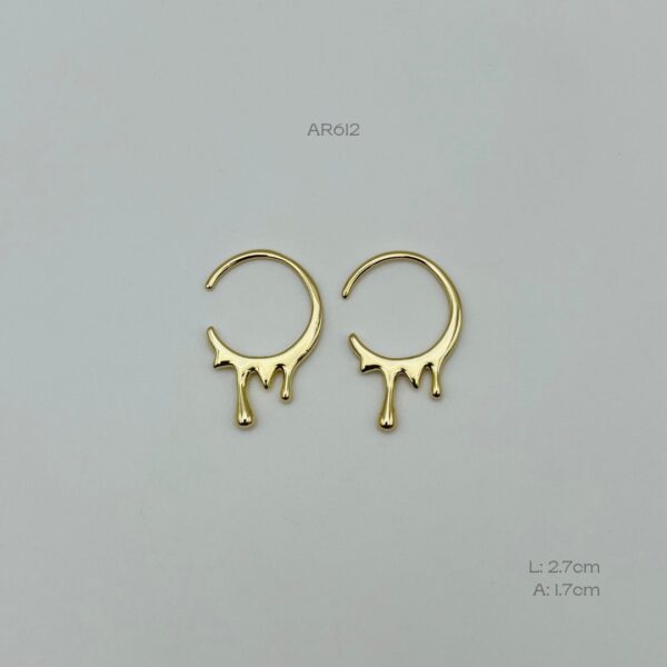 Arete dorado con diseño de oro derretido. Medidas: 2.7cm de largo y 1.7cm de ancho. Oro Laminado 18k.