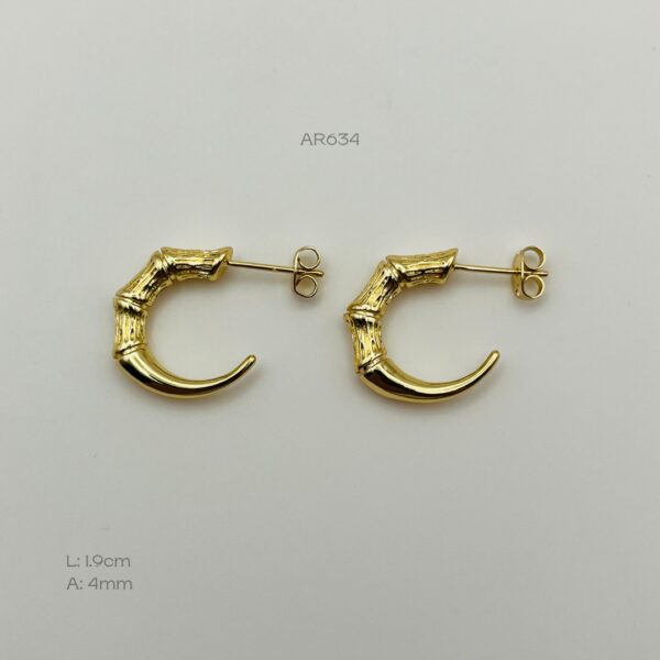 Arete dorado con diseño de cuerno. Medidas: 1.9cm de largo y 4mm de ancho. Oro Laminado 18k.