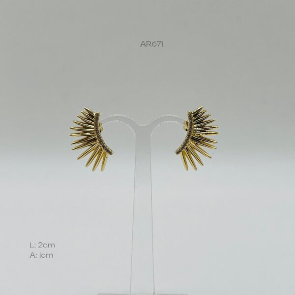 Arete dorado con diseño de cresta con una línea en la base con incrustación de zirconia mini. Medidas: 2cm de largo y 1cm de ancho. Oro laminado 18k.