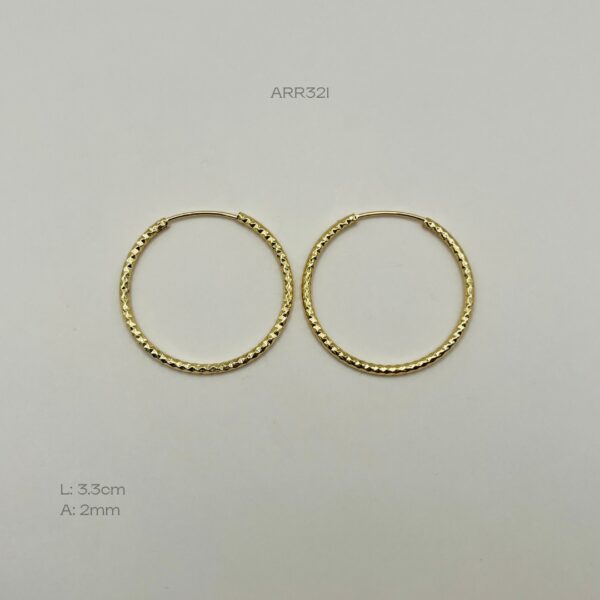 Arracada dorada con diseño facetado con broche de seguridad. Medidas: 3.3cm de diámetro y 2mm de ancho. Oro laminado 18k