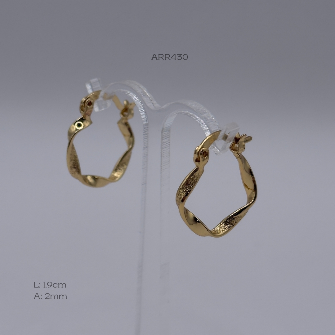 Arracada dorada mini con diseño torzal punteado. Medidas: 1.9cm de largo y 2mm de ancho. Oro laminado 18k