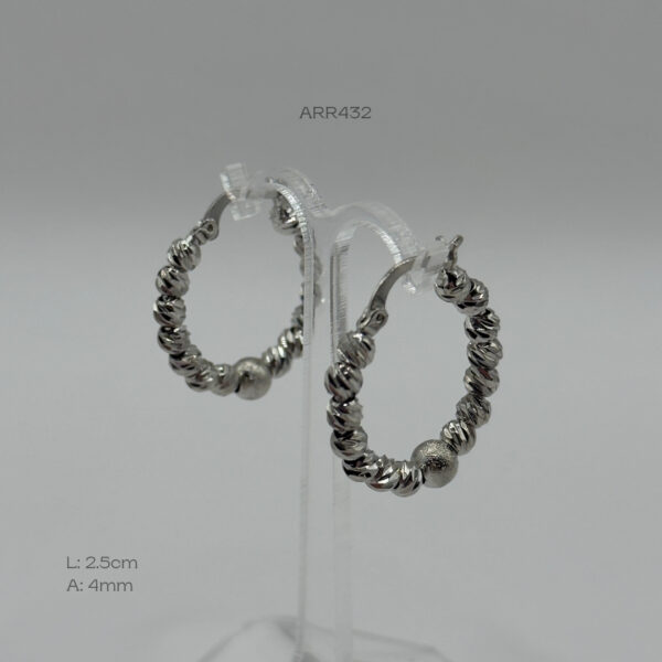 Arracada rodizada con diseño de bolitas con textura. Medidas: 2.5cm de largo y 4mm de ancho. Oro laminado 18k