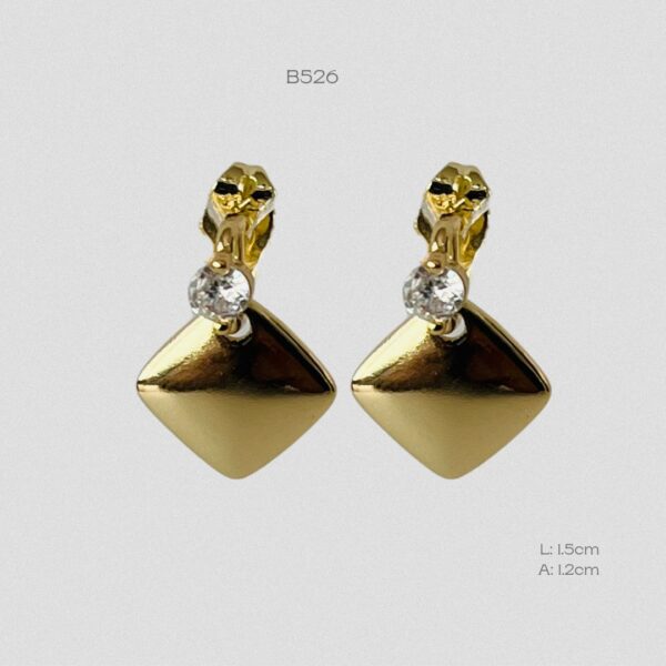 Broquel dorado con diseño de rombo colgante liso con una zirconia en la parte superior. Medidas: 1.5cm de largo y 1.2cm de ancho. Oro laminado 18k