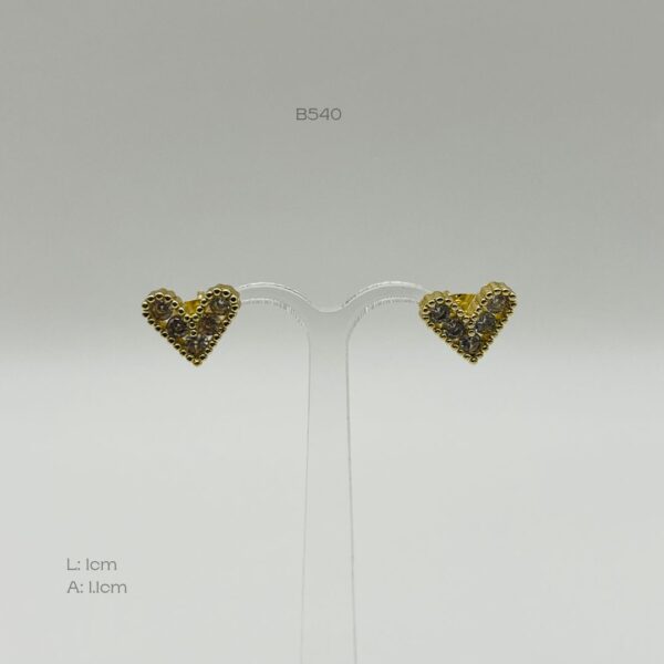 Broquel dorado con diseño de corazón con incrustación de zirconia con contorno punteado. Medidas: 1cm de largo y 1.1cm de ancho. Oro laminado 18k.