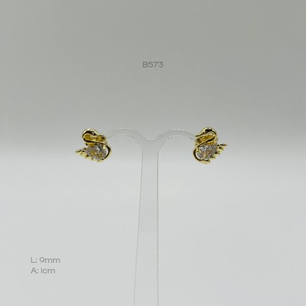 Broquel dorado en forma de cisne, con diseño de incrustación de zirconia en forma de semilla, simulando el cuerpo. Medidas: 9mm de largo y 1cm de ancho. Oro Laminado 18k.