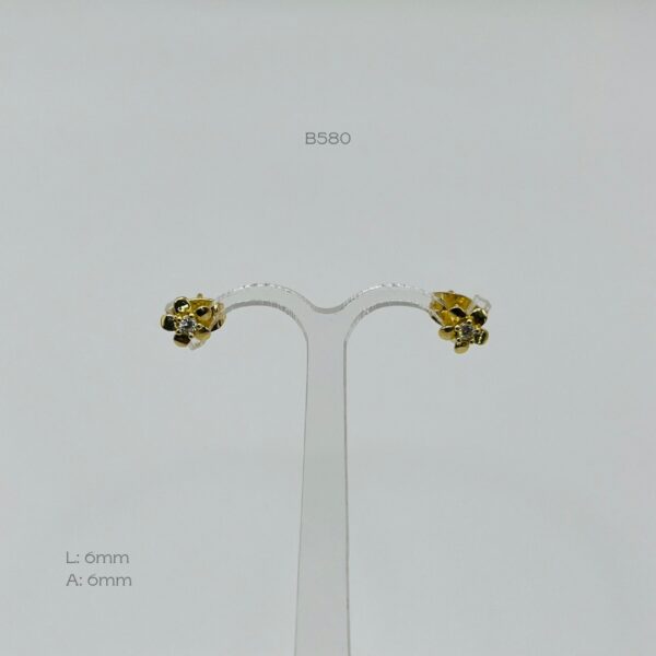 Broquel dorado con diseño de flor con incrusación de zirconia al centro. Medidas: 6mm de largo y 6mm de ancho. Oro Laminado 18k.