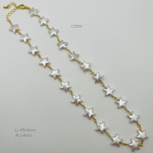 Collar de 45cm + 5cm de extensible, con diseño de estrellas de 1.4cm de ancho. Oro Laminado 18k.