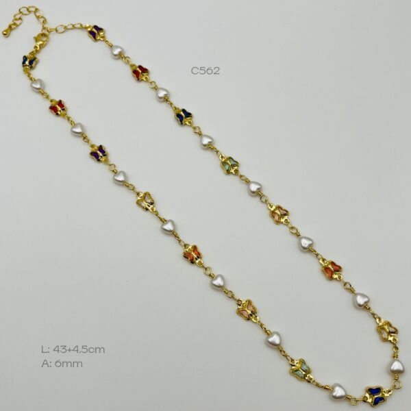 Collar de 43cm + 4.5cm de extensible, con diseño de mariposas de colores intercalado con perlas en forma de corazón de 6mm. Oro Laminado 18k.