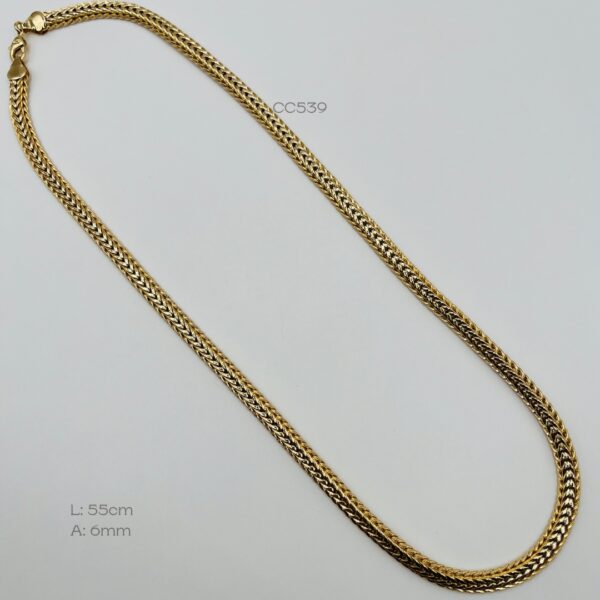 Cadena dorada de tejido espiga. Medidas: 55cm de largo y 6mm de ancho. Oro laminado 18k.
