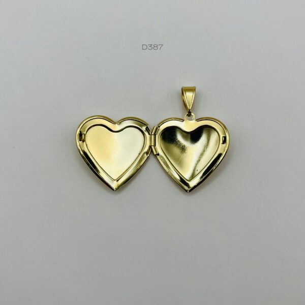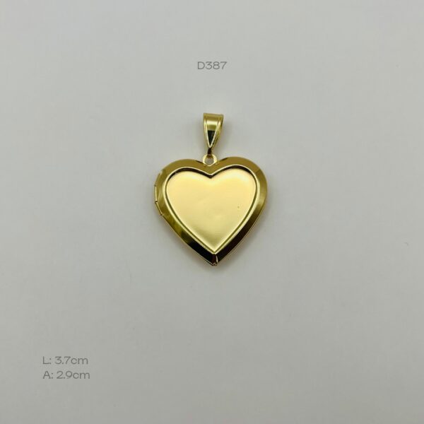 Relicario dorado liso en forma de corazón. Medidas: 3.7cm de largo y 2.9cm de ancho. Oro laminado 18k.