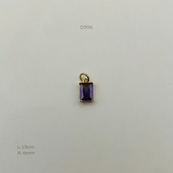 Dije dorado, con diseño de incrustación de zirconia traslúcida rectangular en color morado. Medidas: 1.3cm de largo y 6mm de ancho. Oro Laminado 18k.