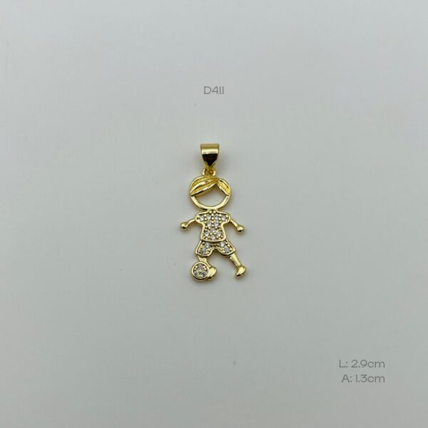 Dije dorado, de niño con un balón de fútbol con incrustación completa de zirconia. Medidas: 2.9cm de largo y 1.3cm de ancho. Oro Laminado 18k.