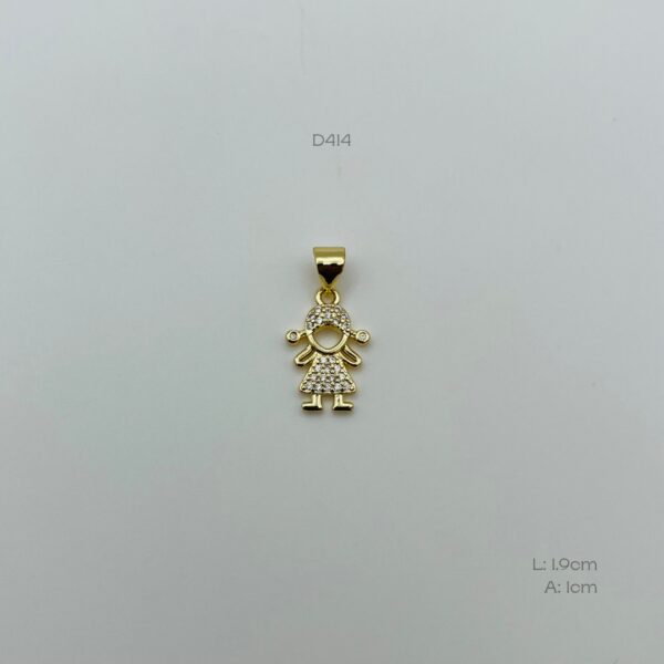 Dije dorado, de niña con incrustación de zirconia simulando el vestido, el cabello y unas colitas. Medidas: 1.9cm de largo y 1cm de ancho. Oro Laminado 18k.