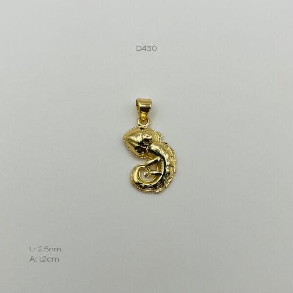 Dije dorado, con diseño de camaleón. Medidas: 2.5cm de largo y 1.2cm de ancho. Oro Laminado 18k.