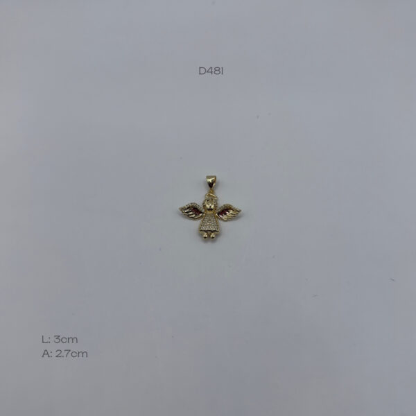 Dije dorado con diseño de angel con zirconias incrustadas. Medidas: 3cm de largo y 2.7cm de ancho. Oro Laminado 18k.
