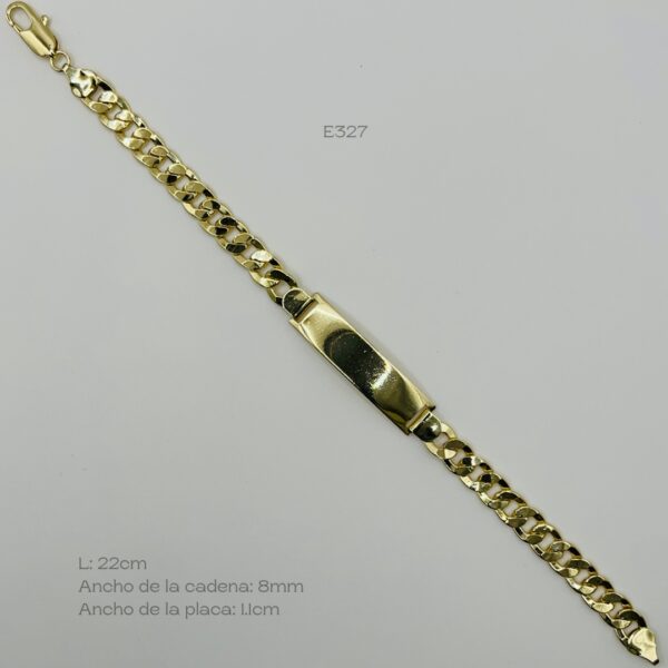 Esclava dorada de tejido barbado, con placa lisa. Medidas: 22cm de largo, 8mm de grosor en la cadena y 1.1cm de grosor de la placa. Oro Laminado 18k.
