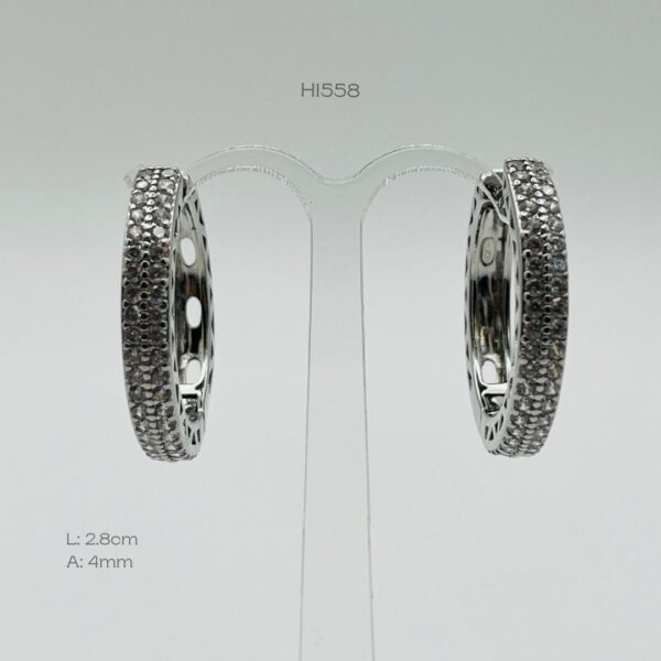 Hoops en rodio con diseño de doble hilera de incrustación de zirconia mini. Medidas: 2.8cm de largo y 4mm de ancho. Oro laminado 18k.