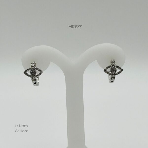 Hoops en rodio con diseño ojos con incrustación de zirconia. Medidas: 1.1cm de largo y 1.1cm de ancho. Oro laminado 18k.
