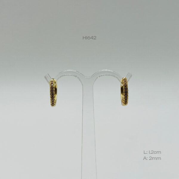 Hoops doradas con diseño de incrustación de zirconia mini en color rosa pastel. Medidas: 1.2cm de largo y 2mm de ancho. Oro Laminado 18k.