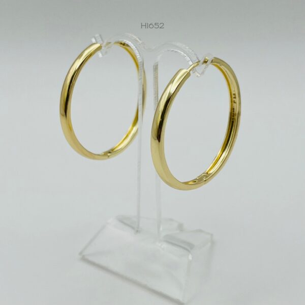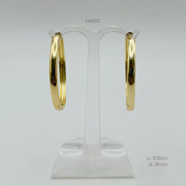 Hoops doradas grandes con diseño liso. Medidas: 3.5cm de largo y 3mm de ancho. Oro Laminado 18k.