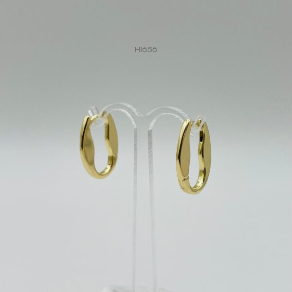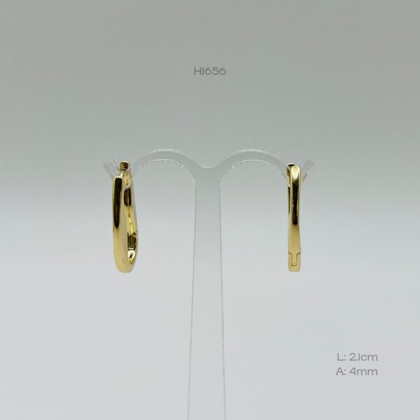 Hoops doradas con diseño alargado plano irregular. Medidas: 2.1cm de largo y 4mm de ancho. Oro Laminado 18k.