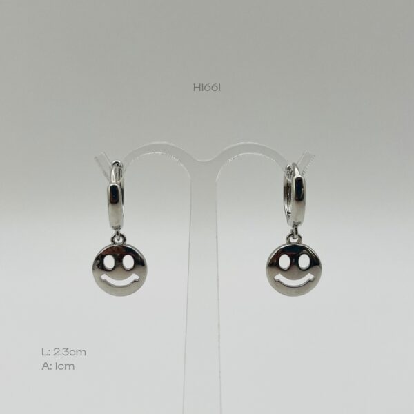 Hoops rodizadas con diseño liso con un colguije de carita feliz. Medidas: 2.3cm de largo y 1cm de ancho. Oro Laminado 18k.