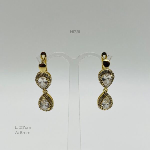 Hoops doradas con diseño de reloj ,de incrustación de zirconia en forma de gota con incrustación de zirconia mini en el contorno. Medidas: 2.7cm de largo y 8mm de ancho. Oro Laminado 18k.