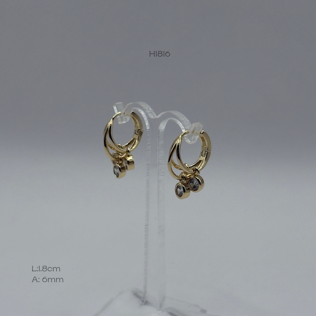 Hoops doradas con diseño triple aro con 3 zirconias colgantes. Medidas: 1.8cm de largo y 6mm de ancho. Oro Laminado 18k.