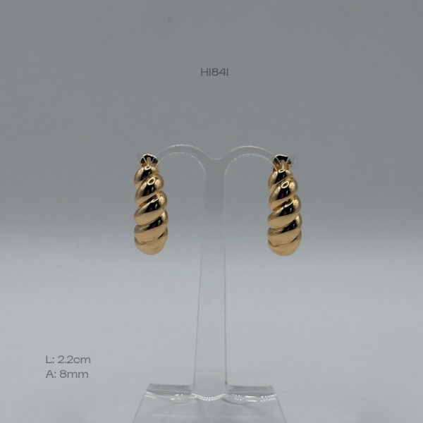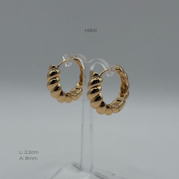 Hoops doradas con diseño torcido. Medidas: 2.2cm de largo y 8mm de ancho. Oro Laminado 18k.
