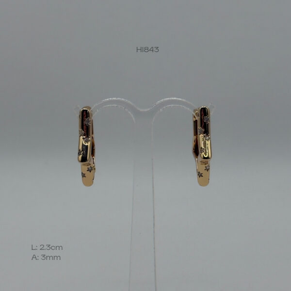 Hoops doradas con diseño de estrella con zirconias incrustadas. Medidas: 2.3cm de largo y 3mm de ancho. Oro Laminado 18k.