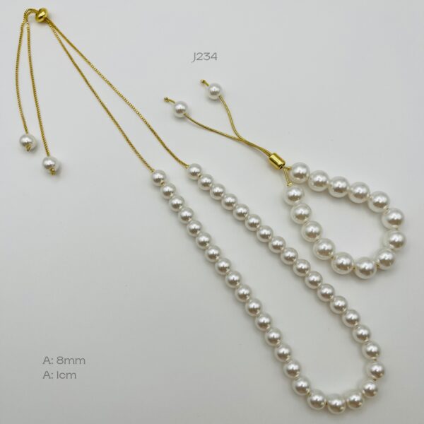 Juego de collar y pulsera ajustables en color dorado, con diseño de perla de 8mm y 1cm. Oro laminado 18k.