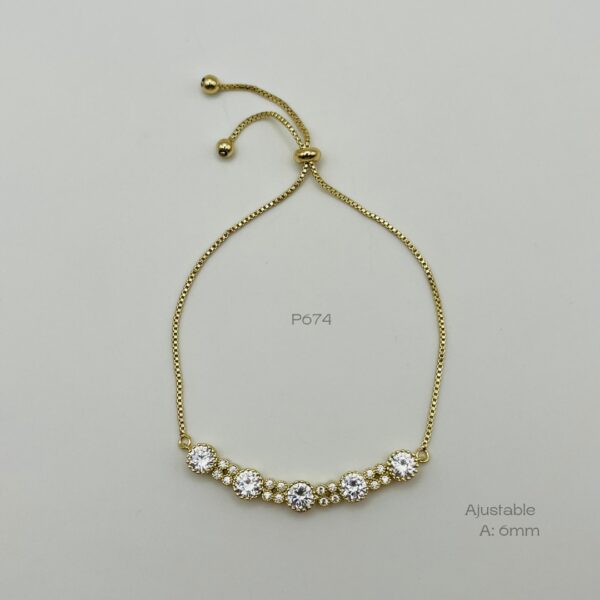 Pulsera ajustable dorada con diseño de zirconia con contorno punteado intercalado con cuatro zirconias biceladas formando un trébol. Medidas: 6mm de diámetro. Oro Laminado 18k.