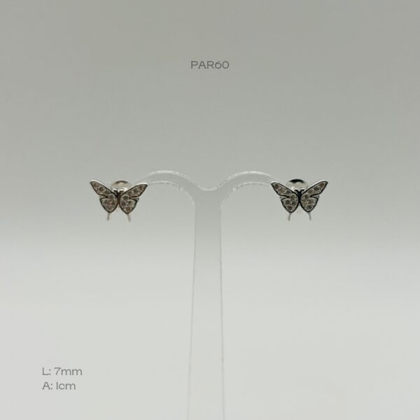 Arete con diseño de mariposa con incrustación de zirconia. Medidas: 7mm de largo y 1cm de ancho. Peso promedio: 1.1gr.