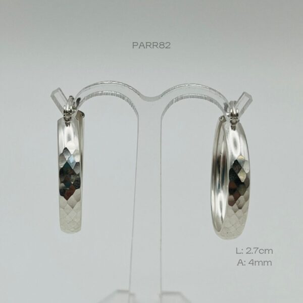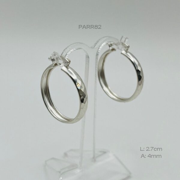 Arracada de plata Italiana con diseño bicelado. Medidas: 2.7cm de largo y 4mm de ancho. Peso promedio: 2.5gr. Plata Ley .925