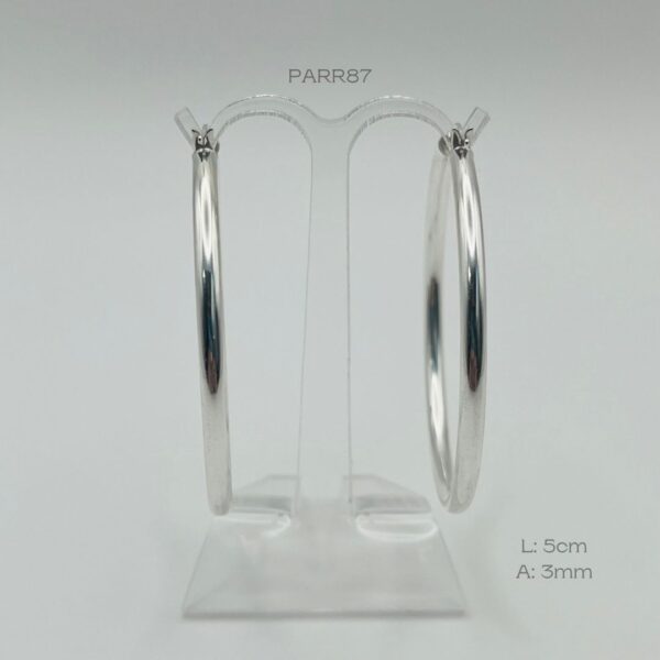Arracada de plata Italiana con diseño liso cilíndrico grueso. Medidas: 5cm de largo y 3mm de ancho. Peso promedio: 7.8gr. Plata Ley .932