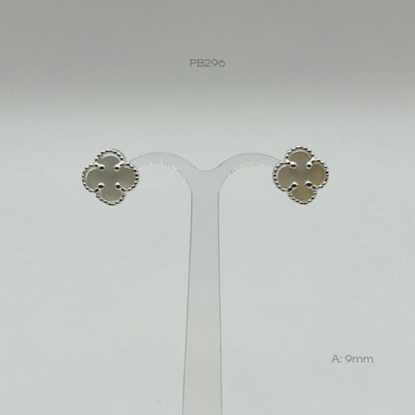 Broquel de plata italiana con diseño de trébol de color blanco de 9mm de ancho, con cierre de mariposa. Peso promedio: 1.9gr. Plata ley .925.