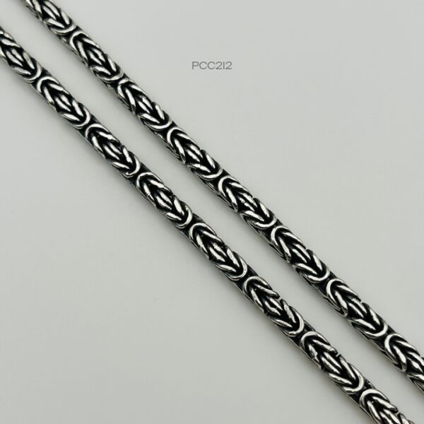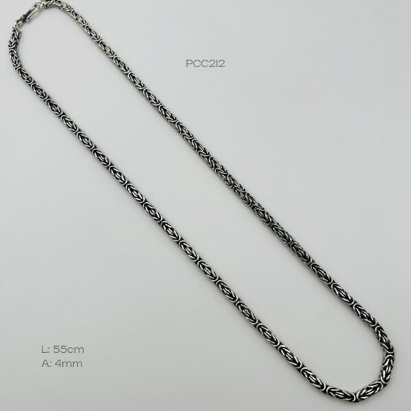 Cadena de plata turca de tejido bizantino pavonado con un broche simulando un anzuelo. Medidas: 55cm de largo y 4mm de ancho, peso promedio: 17.1gr. Plata ley .925