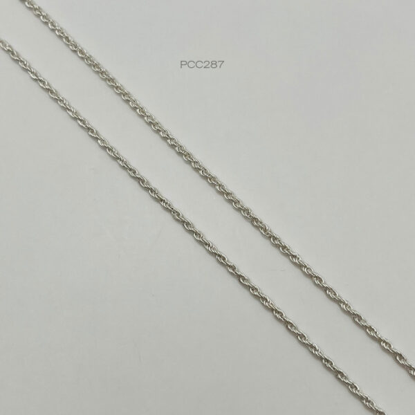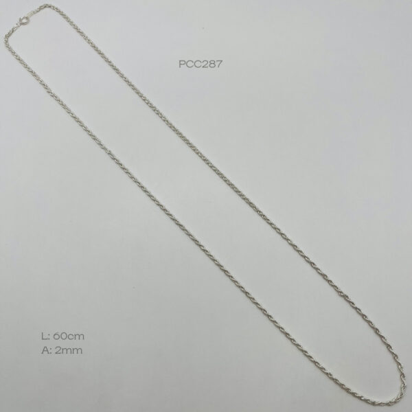 Cadena de plata nacional de tejido torzal. Medidas: 60cm de largo y 2mm de ancho, peso promedio: 6.7gr. Plata ley .925