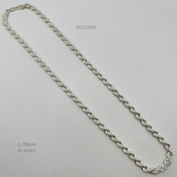 Cadena de plata italiana de tejido torzal. Medidas: 55cm de largo y 6mm de ancho, peso promedio: 52.4gr. Plata ley .925