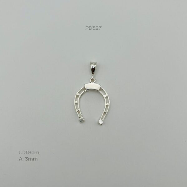 Dije de plata nacional de herradura. Medidas: 3.8cm de largo y 3mm de ancho. Peso promedio: 3.3gr. Plata ley .925